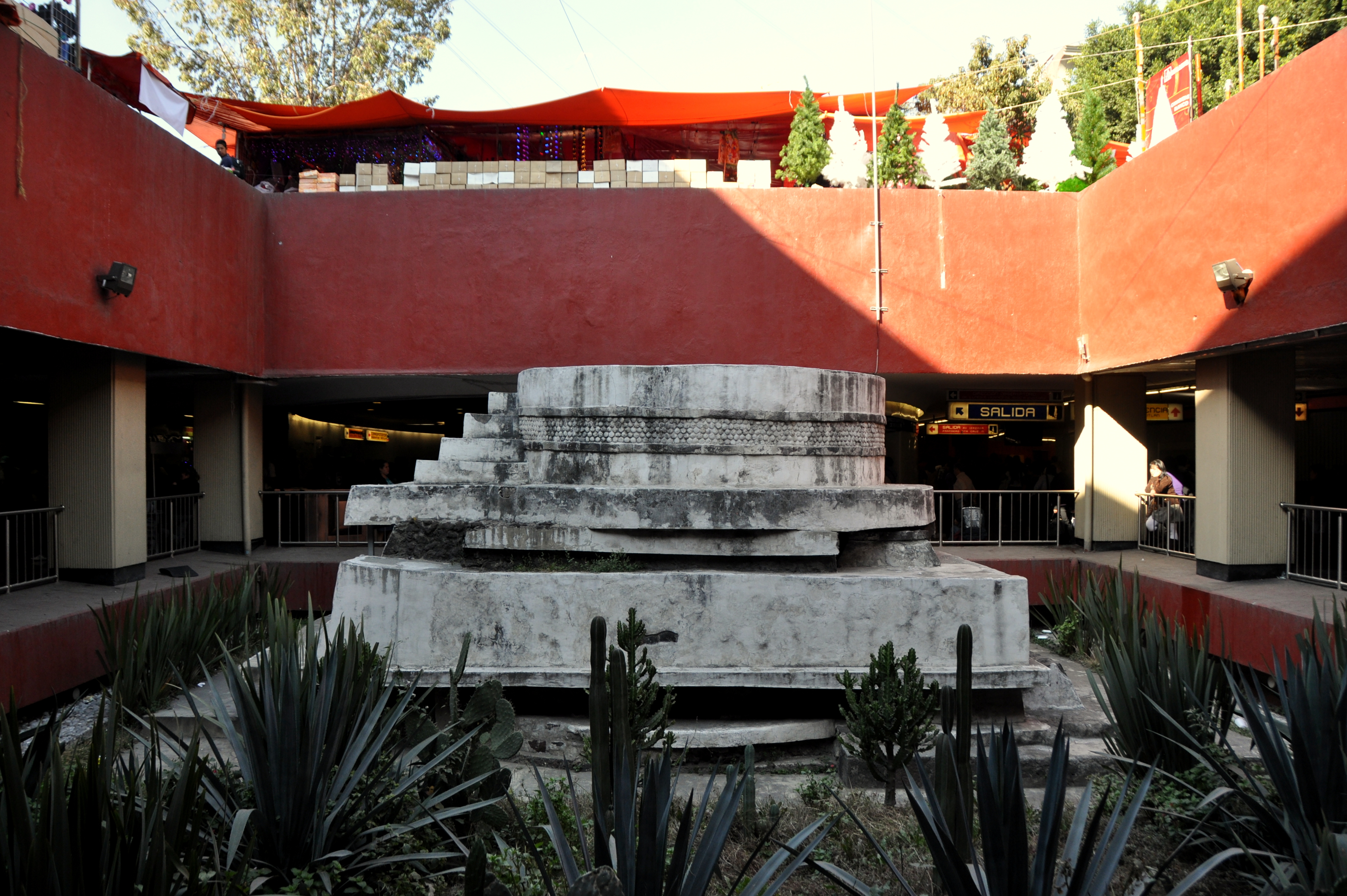 Below pic: Aztec altar at Pino Suárez station. Note the Christmas market at street level and the maguey plants in the foreground. Maguey is used to make pulque, a rather potent beverage unique to central Mexico.