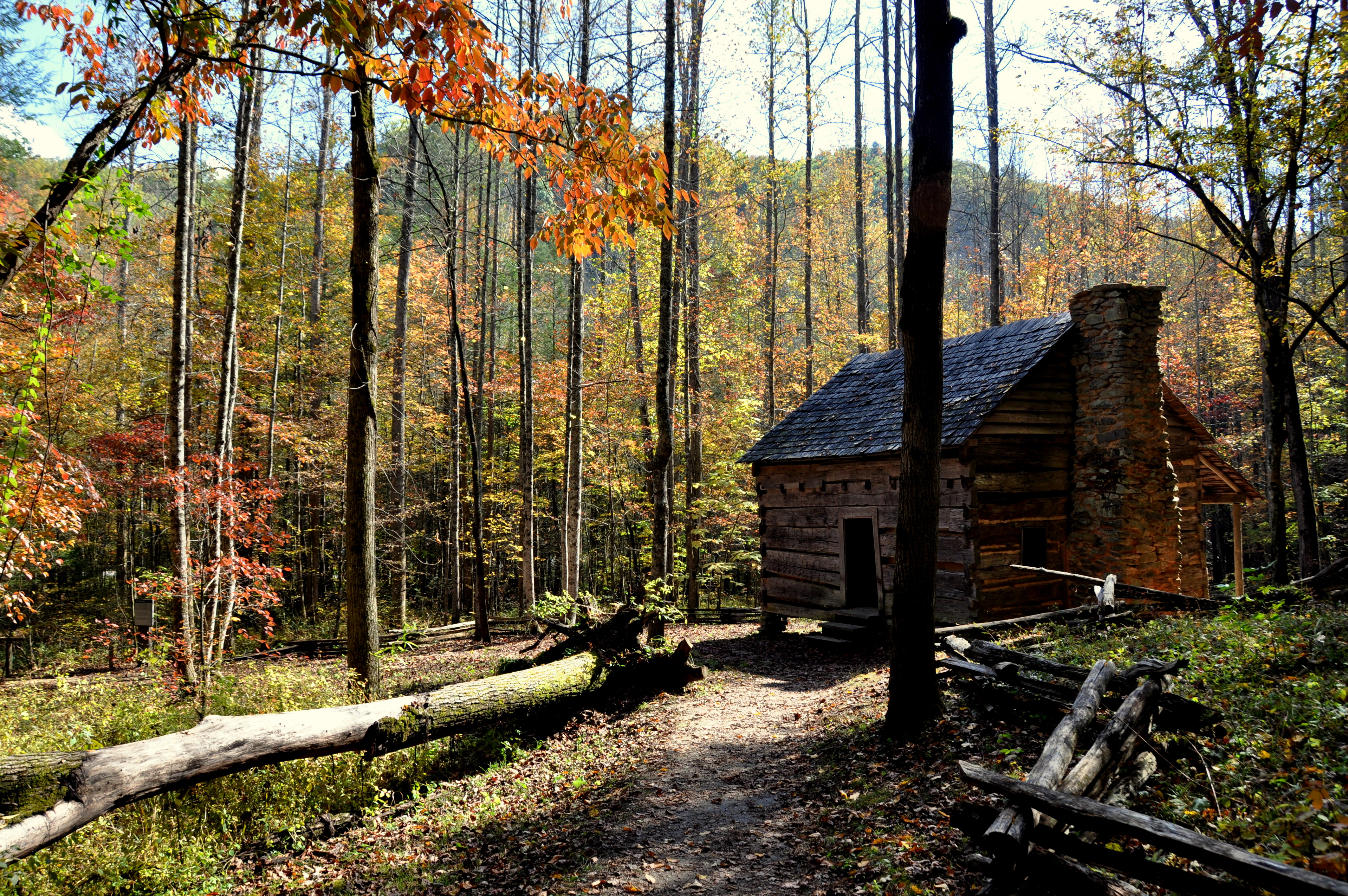 Below pic: Log cabin and fireplace, Great Smoky Mountains National Park.