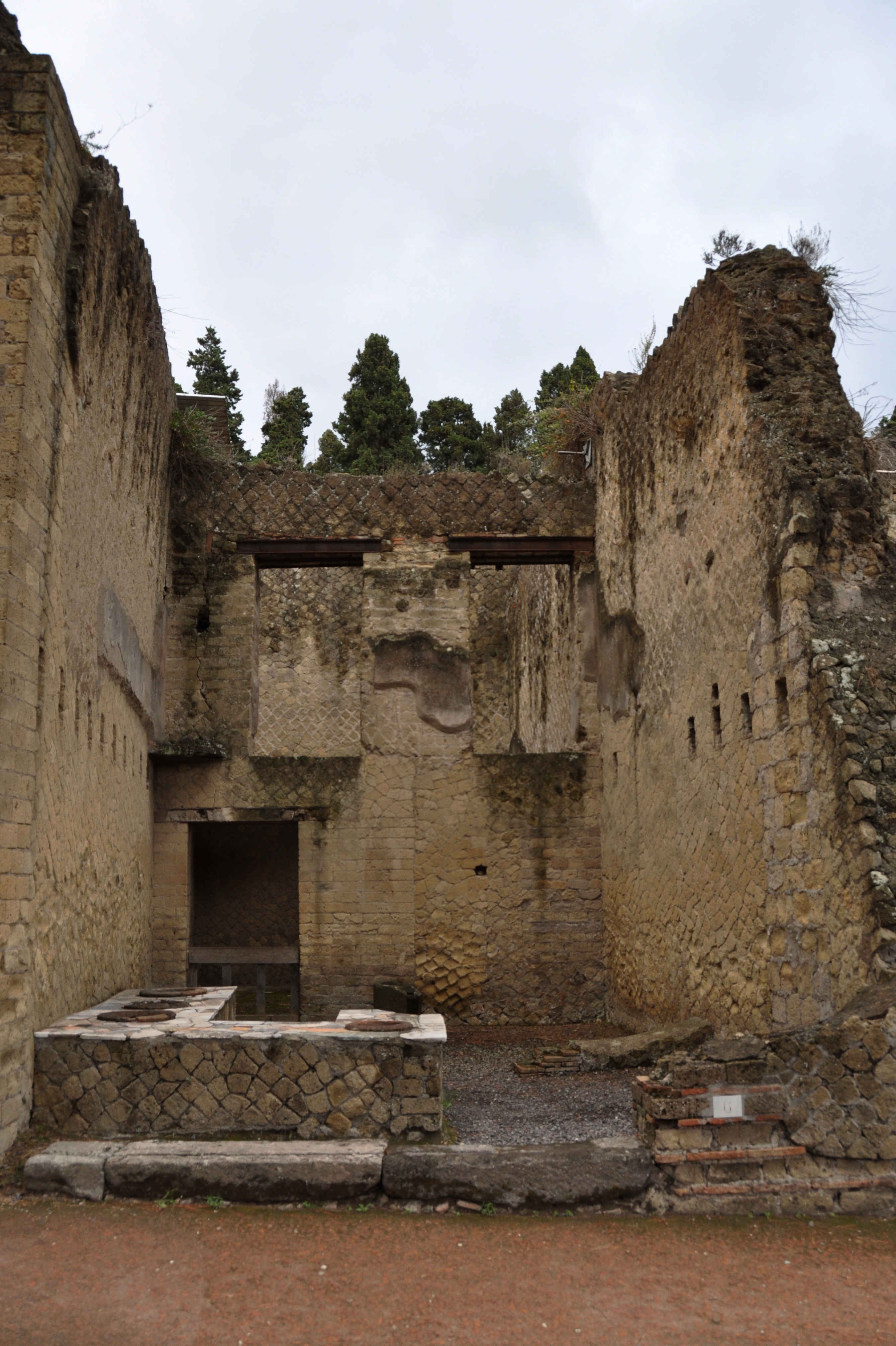 Herculaneum was blanketed by ash, not lava. The weight of the ash was enough to bring down the roofs of most buildings, but they have otherwise survived in excellent shape. Their kilns, frescoes, and mosaics are in much the same shape as those at Pompeii, yet they have received far less funding for restoration and have only been open for tourism for three decades.