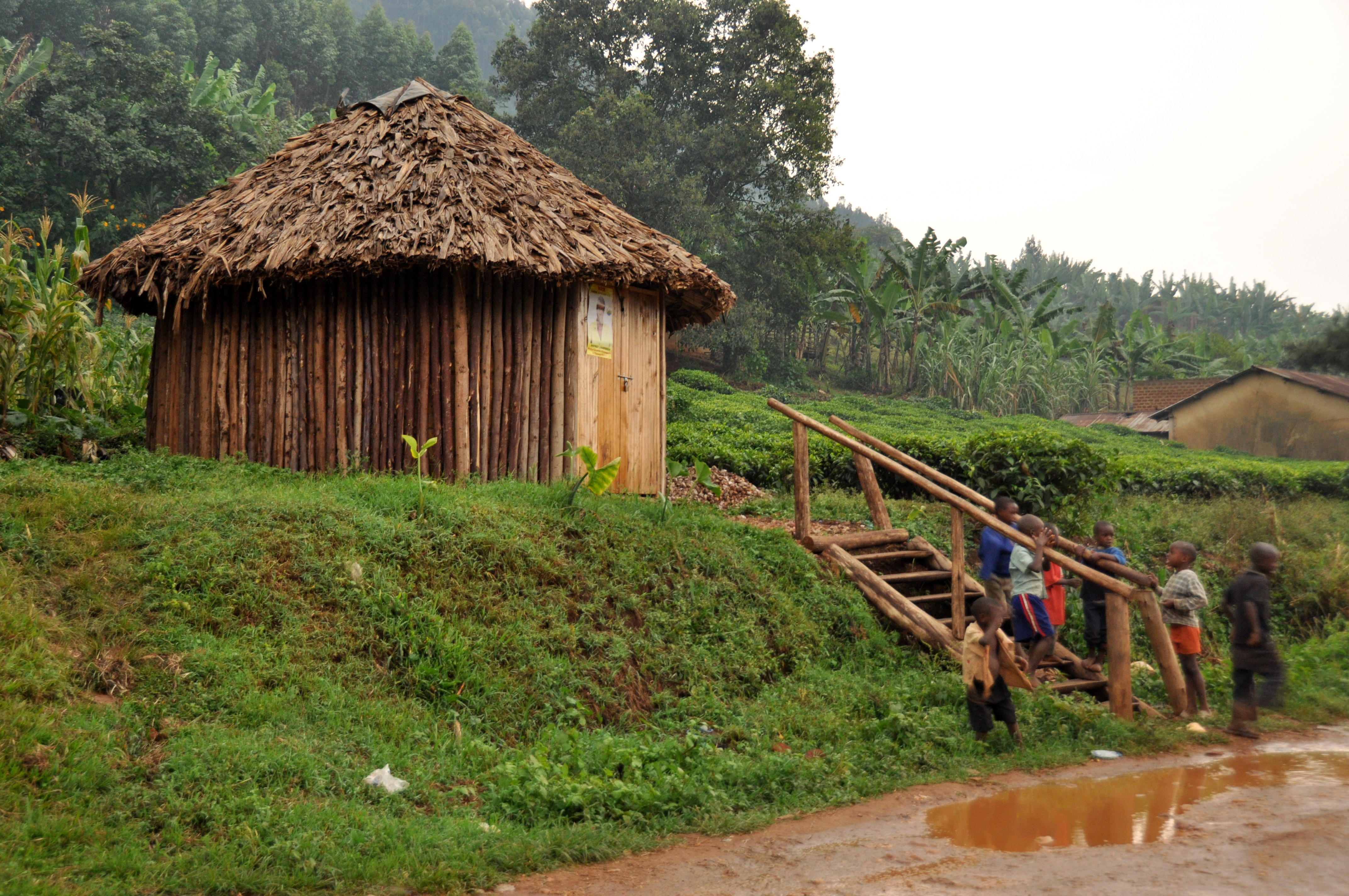 We kept waiting for the storm to pass. If you’ve spent any time in a humid climate you know that tropical thunderstorms seldom last longer than 15 minutes, and that 15 minutes after that there is often no sign that any rain fell at all. This day seemed to be the exception, so we finally agreed to turn back. Three minutes after we hit the trail again, the rain stopped. We were weather-weary, though, and simply headed back to our respective lodges without ever making it to the falls. Once back at camp, I ordered a cup of warm Ugandan tea, then changed out of my wet clothes. I hung them out to dry; they were still wet three days later.