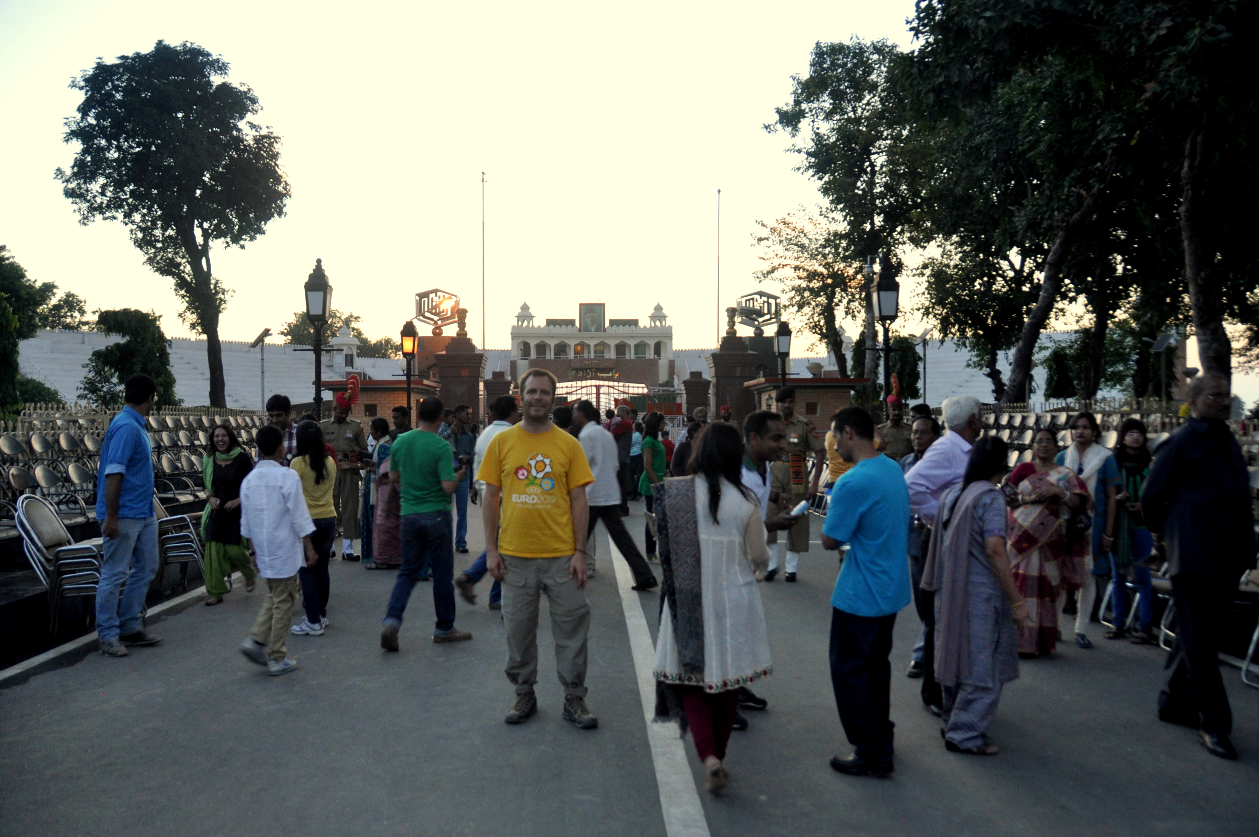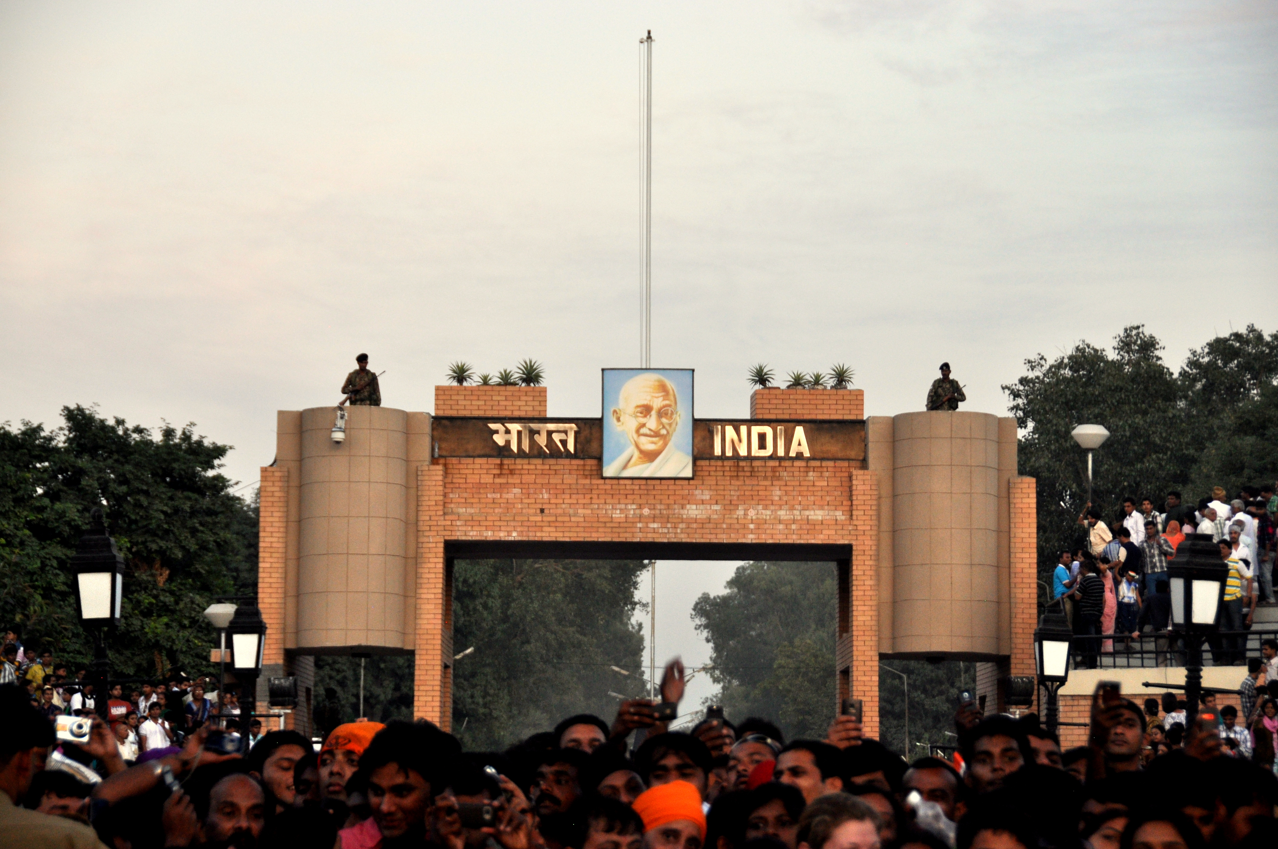 The emcee concluded his rally and focus returned to the border guards. They took turns sprinting towards the Pakistan gate. When they finished, each nation simultaneously lowered its flags, and guards from each side shook hands with guards from the other. A rope holding back spectators on the Indian side was lifted, and the ceremony was over for one more day. Crowds on the Indian side, easily several hundred-thick, slowly dispersed. Many gathered for photos with the Pakistan entrance behind them, while just as many greeted traveling family members who appeared to have just crossed the border in time, and lingered to watch the festive closing ritual. If you have ever witnessed family members separated by distance reunite at an international airport’s arrivals hall, you’ll know that scene of serenity and happiness…only this time it exists at one of the most volatile border crossings in the world!