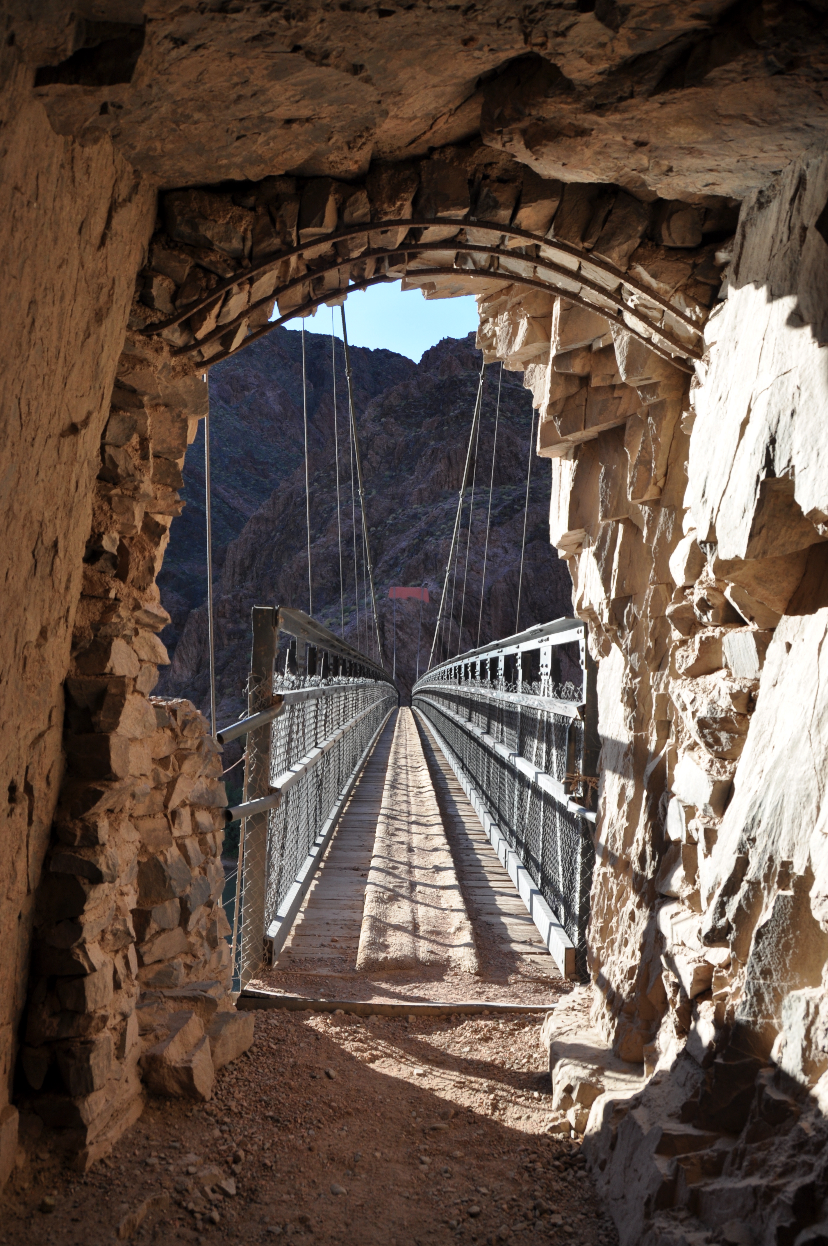 Continuing down from here, the trail got ever steeper, but finally entered the shade as it contoured behind a rock wall that blocked out the sun’s rays – if only for a moment. The Colorado River popped into view and I soon reached a fork. The River Trail (to the left) led a short distance to the Bright Angel Trail, while the trail straight ahead soon entered a tunnel which, in turn, opened onto Black Bridge, one of just two pedestrian suspension bridges spanning the Colorado River.