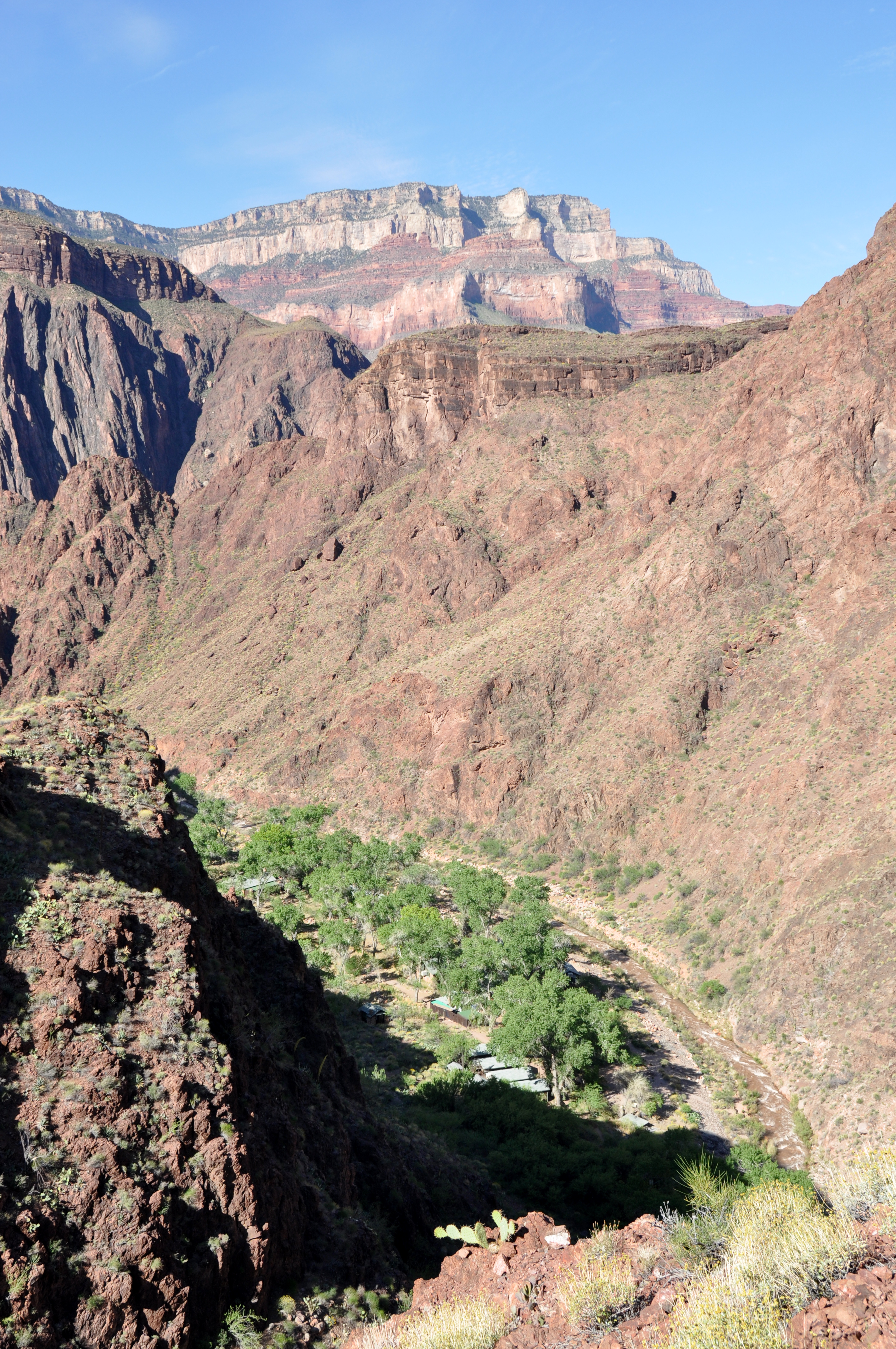 The trail passed a spur trail (the Clear Creek Trail) to the left. It wasn’t marked on my map so I gave it a pass; I had a 6:30 p.m. dinner reservation at Phantom Ranch that I didn’t want to be late for. I did climb just high enough on my hike out two days later to get this aerial view of Phantom Ranch, with the sun-baked South Rim in the farthest photographic reaches: