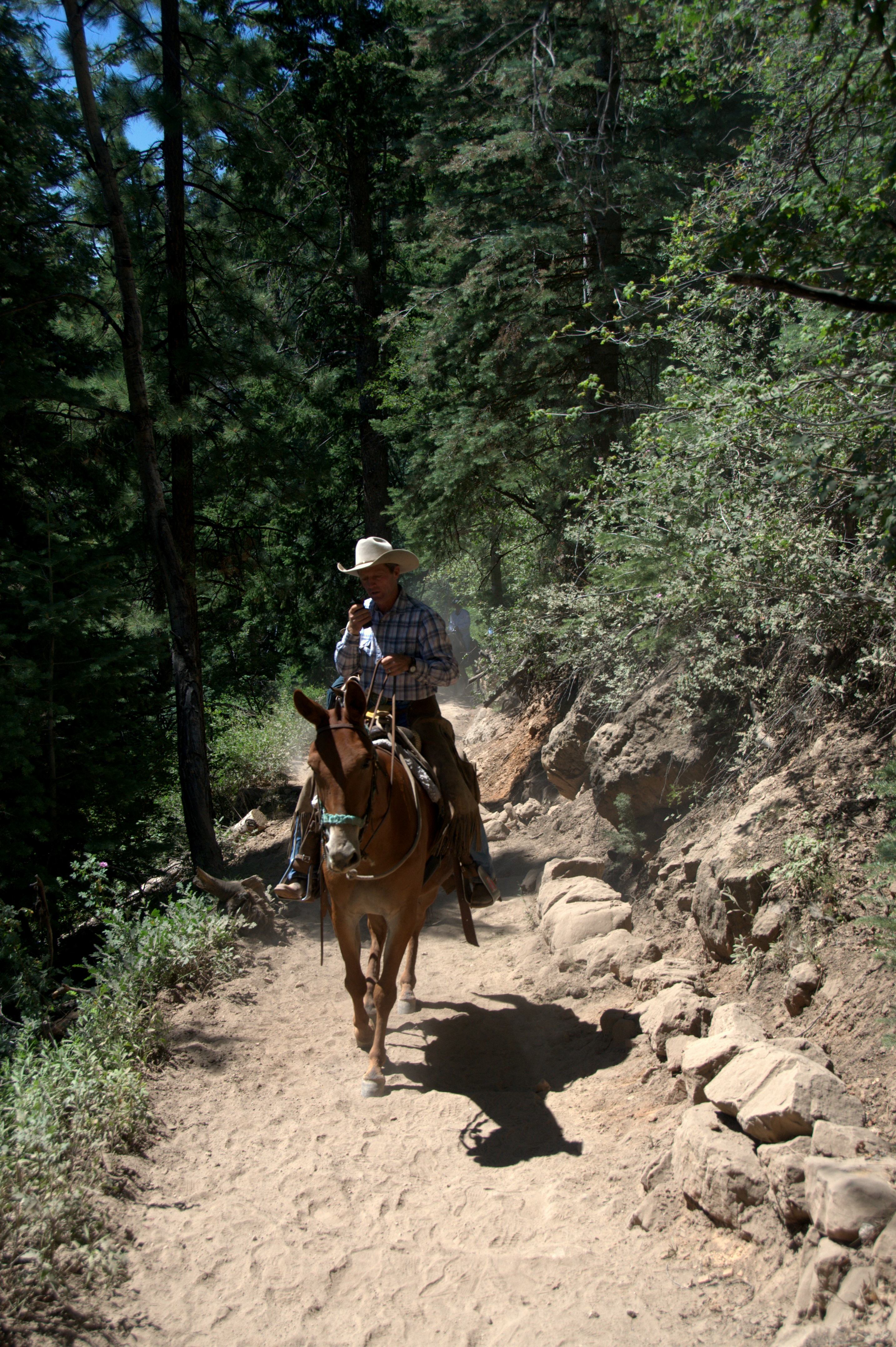 The trailhead sits in the woods alongside the road to Grand Canyon Lodge and the main North Rim overlooks. From the trailhead itself, the Grand Canyon itself is nowhere in sight. Was I in the right place, I wondered as I applied sunscreen and grabbed trekking poles from the trunk of my car? Just then, a mule train complete with riders, “Brady Bunch”-style, passed in front of me and proceeded down the dirt trail, kicking up a cloud of dust that would make Pig Pen, of “Peanuts” fame, jealous.