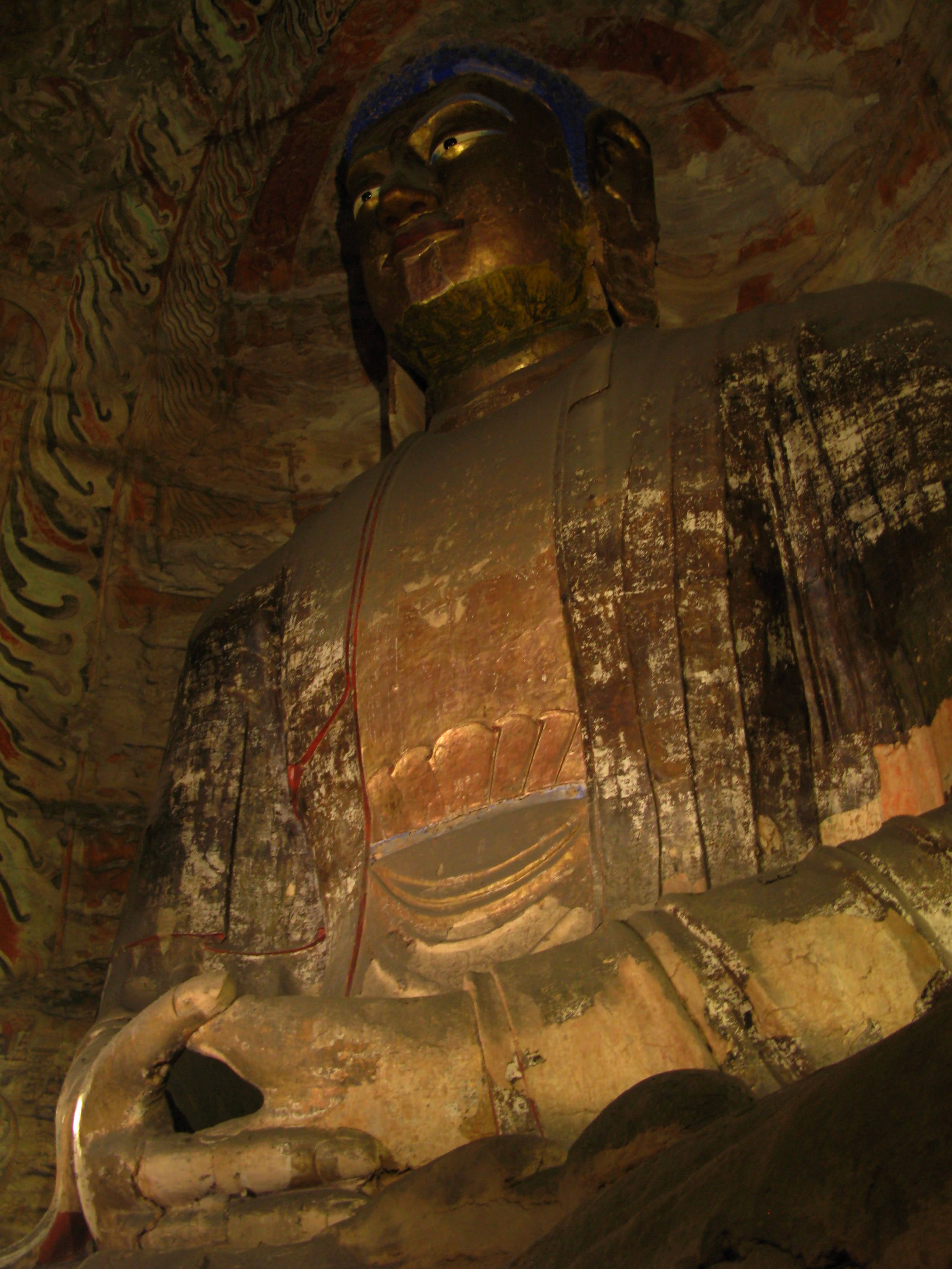 Some Buddha (and Bodhisattva) carvings are remarkably well-preserved, such as the blue-haired Buddha above…