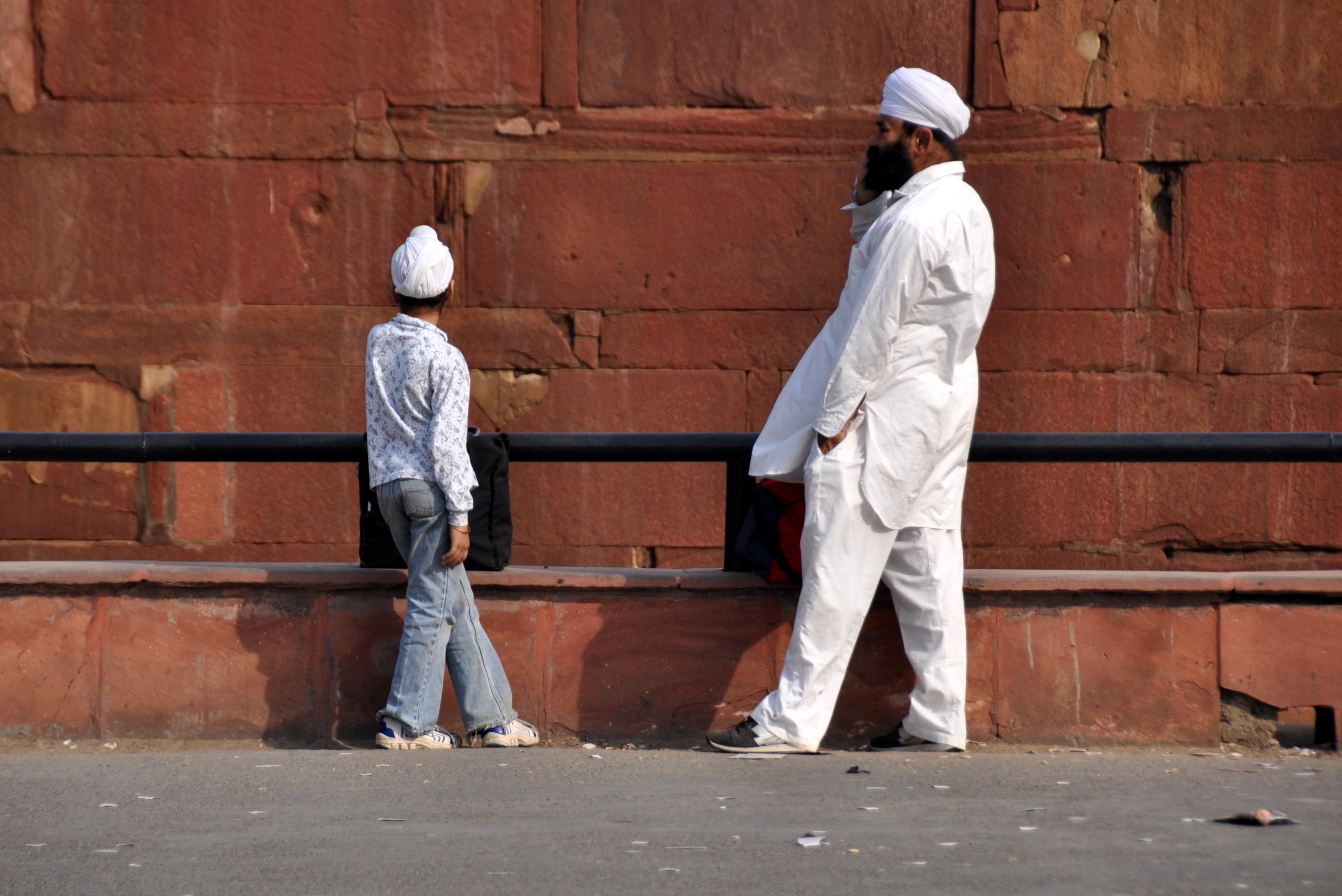 A Sikh father and son wait for their wife/mother to finish souvenir shopping in the covered bazaar that leads to the interior of the Red Fort.