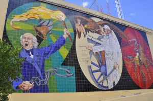 I waited for the large courtyard in front of the church to clear out, and posed for the picture above. My attention was then drawn to a callejón (alleyway) to the left of the church. Students were sitting on benches surrounding saplings at the alley’s entrance, and an enormous mural dominated one of the walls. The mural, entitled “War of Independence” and painted by local resident José Ignacio Aguilar Rangel, features Mexico’s trifecta of independence heroes, Hidalgo, José María Morelos, and Vicente Guerrero. The mural lacks the modernism that defines works by superior artists such as Diego Rivera and David Alfaro Siqueiros, but it succeeds in conveying the patriotism of its subjects, each poised in battle or ready to declare victory.