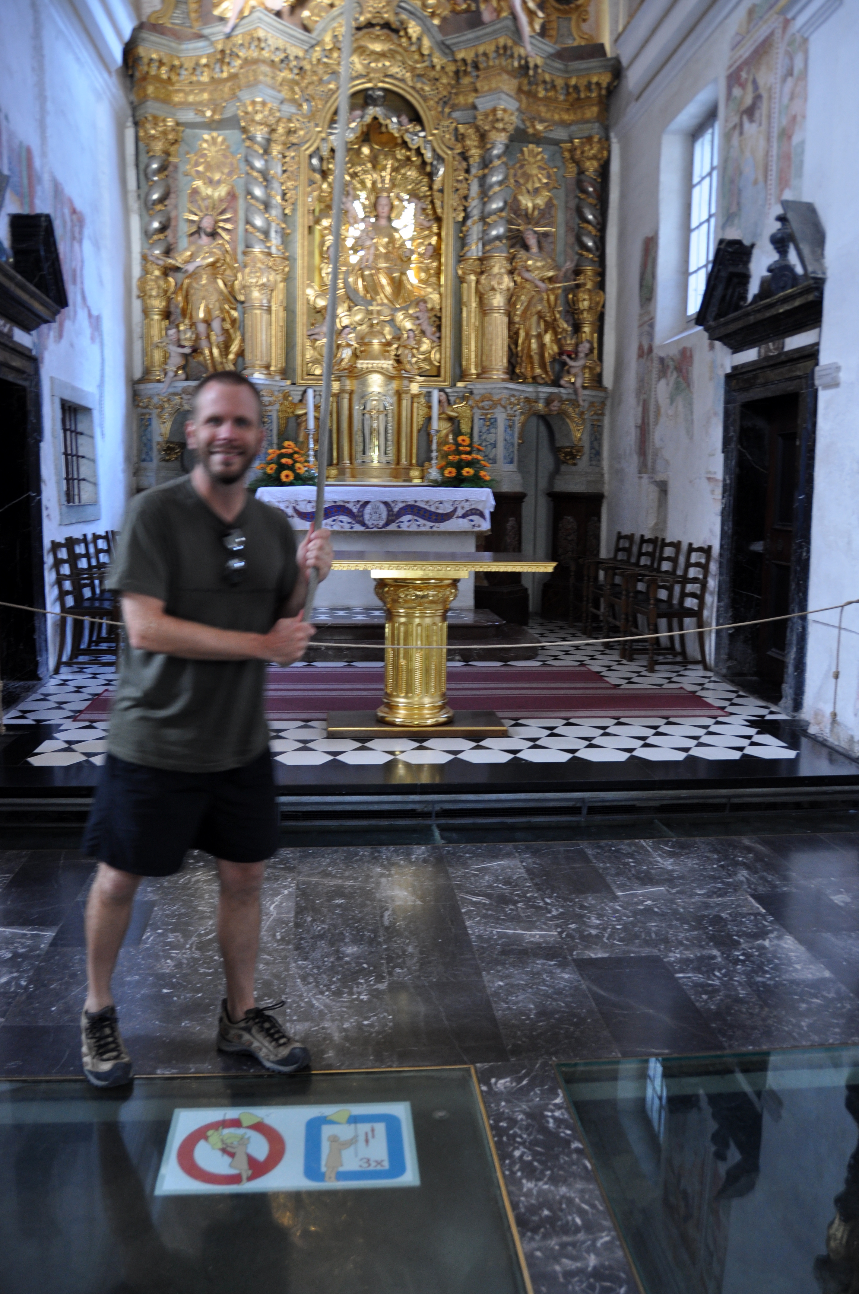 The highlight for most visitors is ringing the bell. As you can see, signs on the floor instruct you where to stand to get the loudest gong. Harder than it looks. (As for my attire, which I admit is not church-appropriate, my only defense is that earlier that same afternoon I was swimming in the lake.)