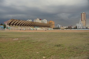 The malecón curves south immediately past the U.S. Embassy, and passes a series of architectural eyesores, such as this soccer pitch and the burgundy-and-creme apartment tower beyond it, that are distinctly Soviet in style.