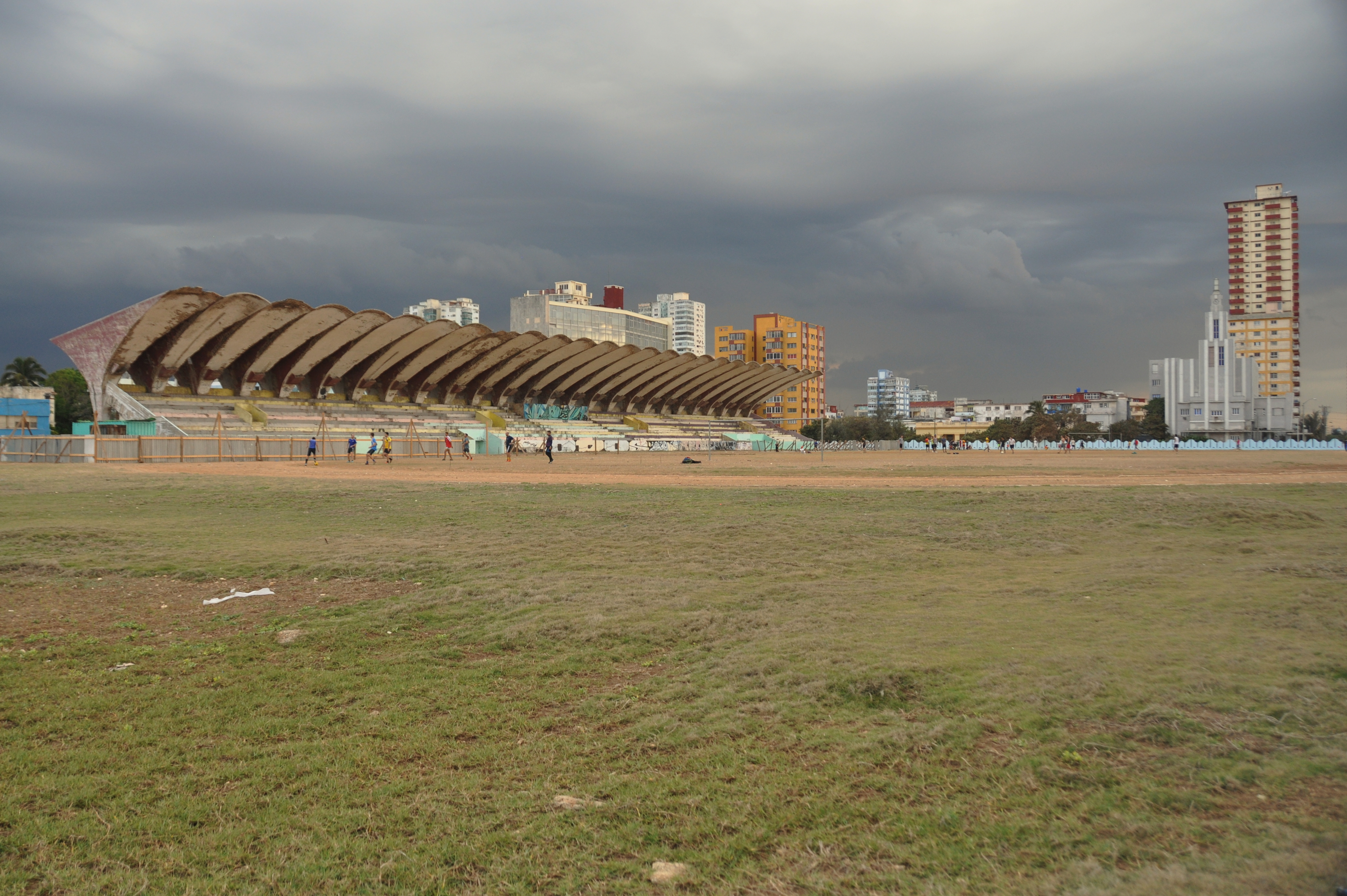 The malecón curves south immediately past the U.S. Embassy, and passes a series of architectural eyesores, such as this soccer pitch and the burgundy-and-creme apartment tower beyond it, that are distinctly Soviet in style.