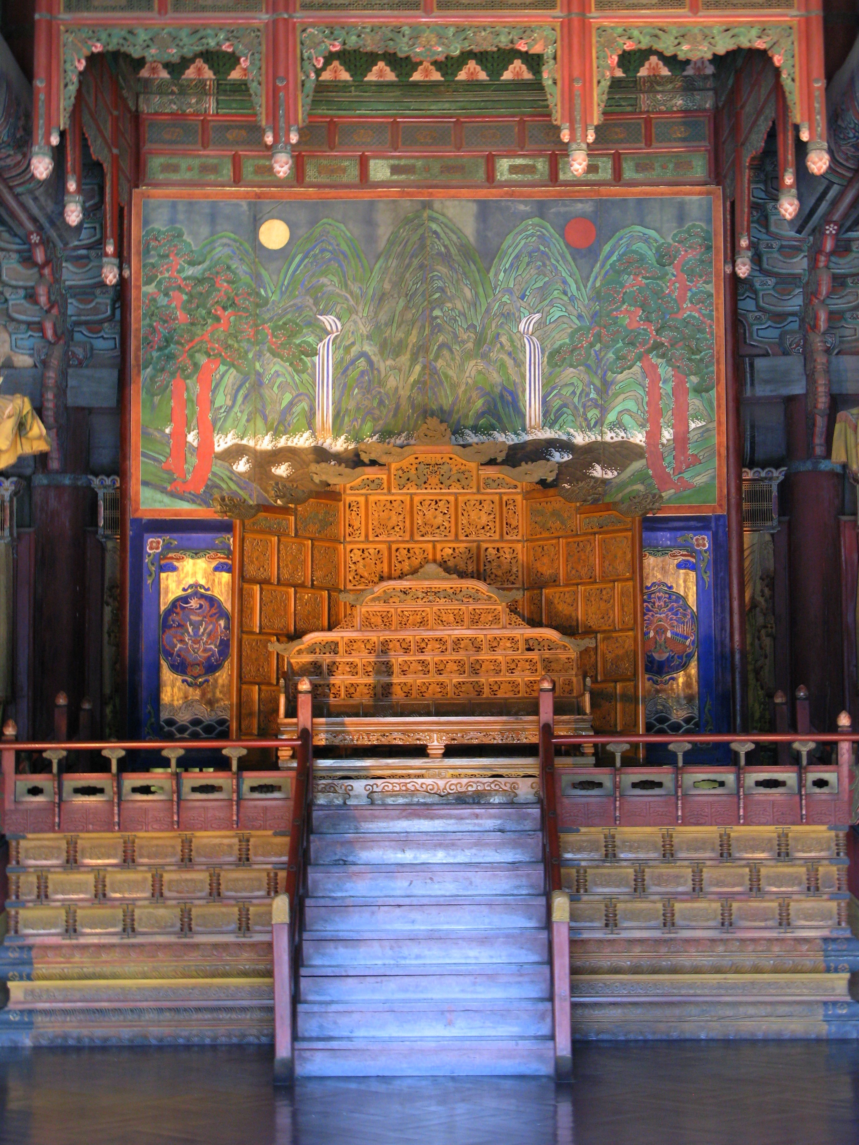 Gyeongbokgung Throne Room, built for King Taejo in 1394, destroyed by fire in 1553 and rebuilt the following year.