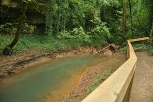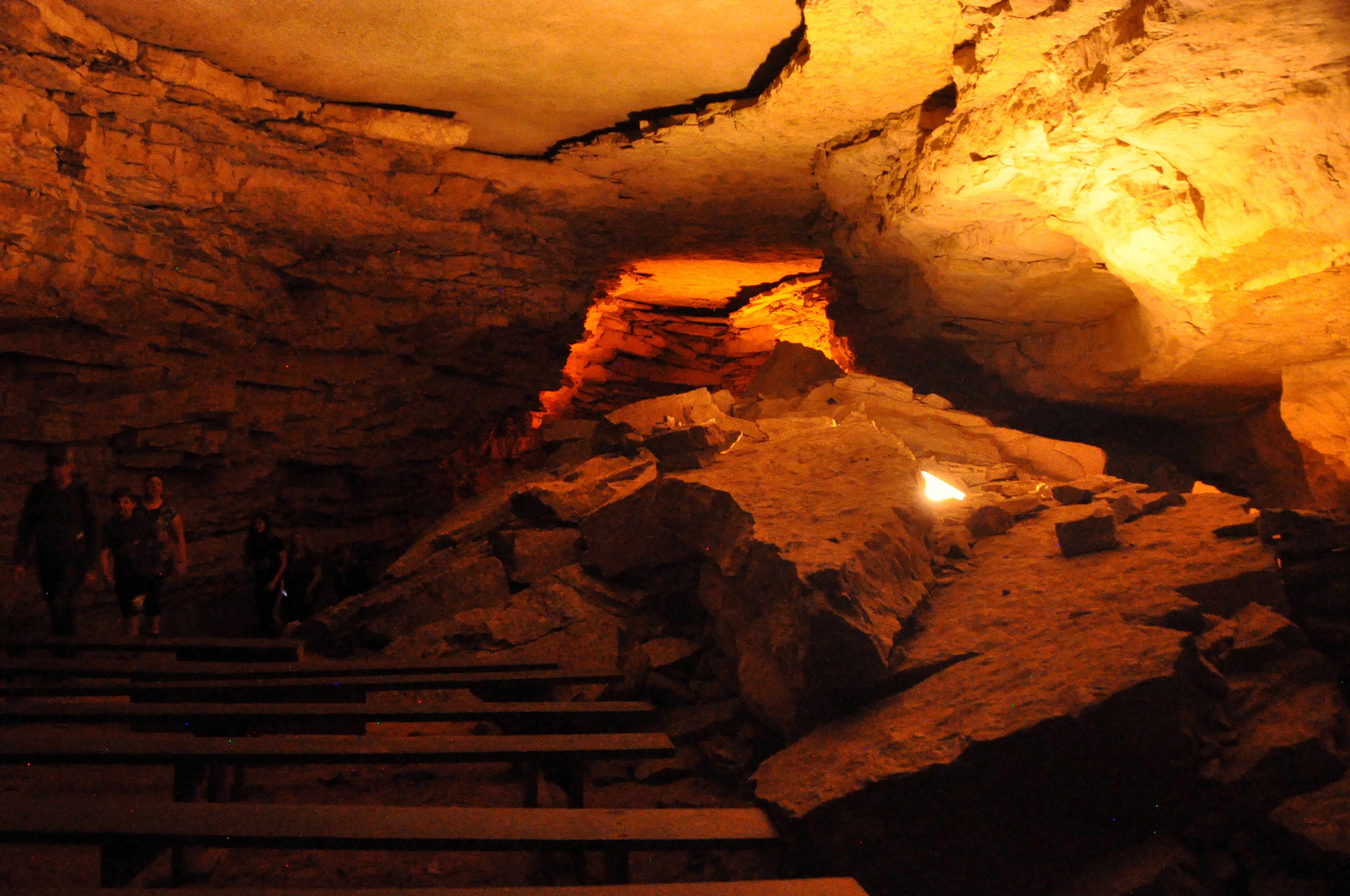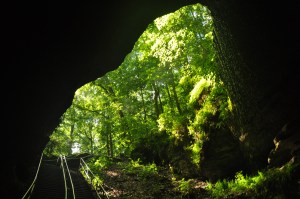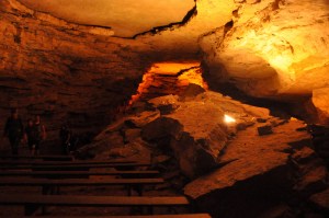 Ugh, I’m rambling. Bear with me. There is a lot to see around the visitor center. A series of hiking trails, none too difficult, pass various points of interest, including Mammoth Sink, a sinkhole near which I observed several wild turkeys foraging, and the appropriately-named Green River, which eventually flows into the cave system itself. One of the trails passes the Natural Entrance to Mammoth Cave. Here, you can hike perhaps 30 yards into the cave itself before encountering a locked gate, but what I remember most was the gentle waterfall cascading off the lip of the entrance, and the gust of cool air emanating from the cave itself. (Mammoth Cave boasts a year-round temperature of 54 degrees.)