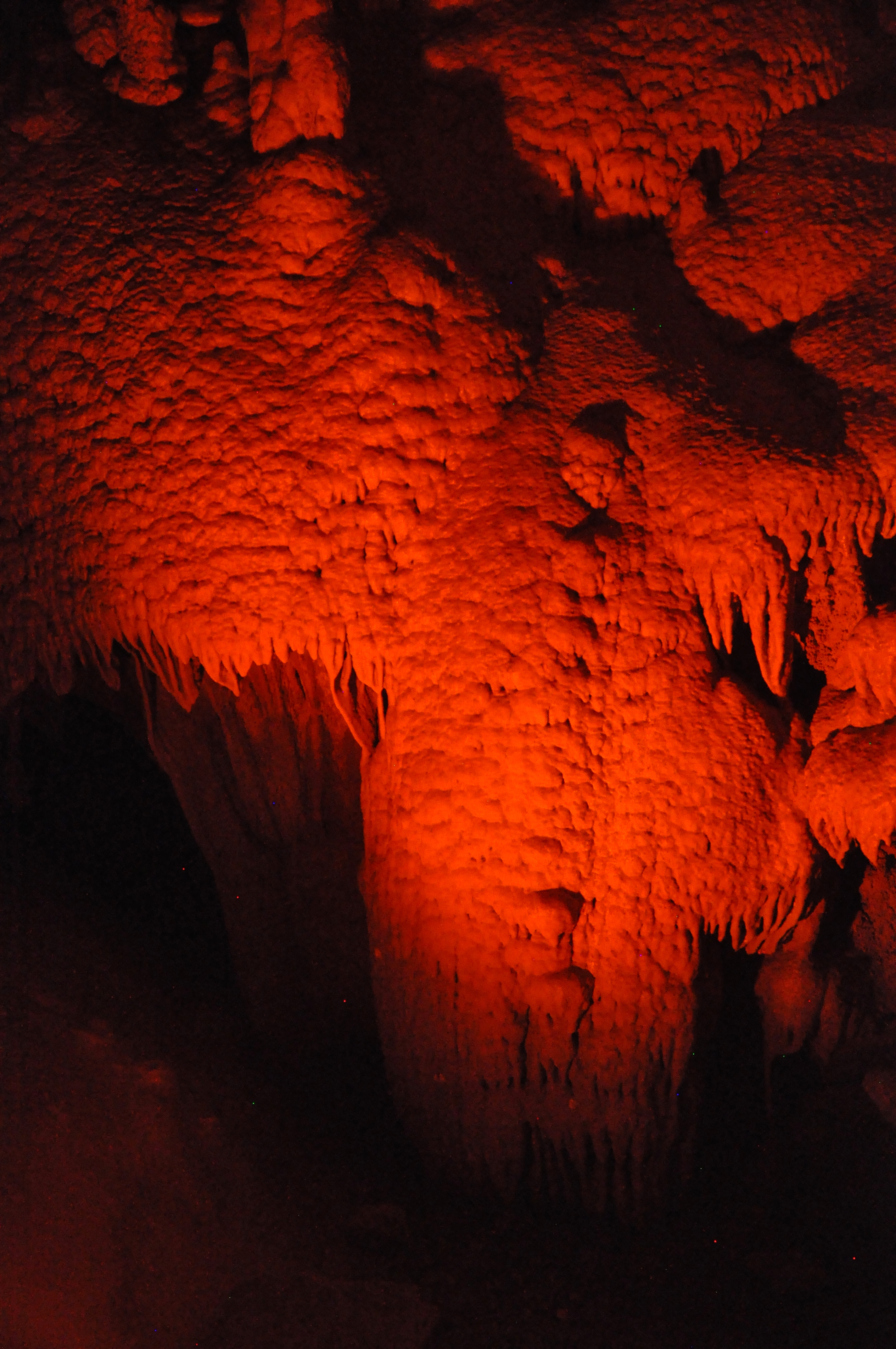 The national park’s website contains a font of information, and it was while browsing the site the day before I left that I decided the Domes and Dripstones Tour was the one I wanted. (GringoPotpourri note: park entrance is free, but cave tours cost money and sell out quickly during summer months.) This tour covers approximately two miles of underground terrain, and exits from a difference access point than it enters. Refurbished school buses ferry tourists, 200 of them all told (yikes!), to the cave itself. The entrance, built into a natural sinkhole, has visitors descend several flights of steel stairs deep into the earth, while water drips down from above. The group would stop to rest at several “dry” chambers, atmospherically-floodlit. Each stop took several minutes for everyone to slowly pile into the room, and I used this time to take pictures, though the low light and the “no flash” rule resulted in generally-lousy pictures. The image below is one of the better ones: